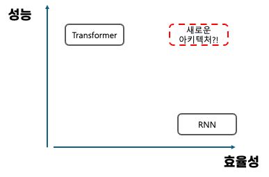 트랜스포머는 성능은 좋지만 비효율적이고, RNN은 효율적이지만 성능이 낮아 각각 성능 우선, 효율성 우선에 방점을 찍고 있는데요. 점선과 같은 “새로운 아키텍처” 처럼 성능과 효율성을 모두 가지는 아키텍처를 찾기 위한 연구가 꾸준히 진행중이지만 대부분 트랜스포머의 성능에 미치지 못했기에 크게 주목을 못받고 있었습니다.