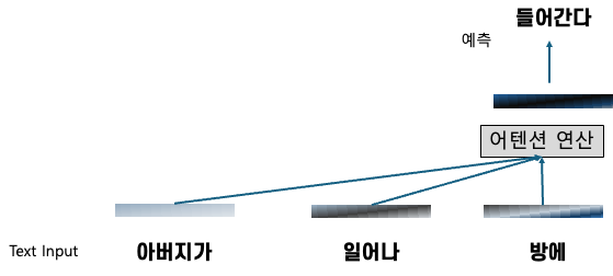 RNN이 하나의 Hidden State로 맥락을 압축했던 것과 달리 매갉 데이터를 그대로 모두 활용해 다음 단어를 예측하는 방식으로 매커니즘을 바꾼것입니다. 이를 좀더 쉽게 설명하면 “들어간다”를 예측할 때 이전의 맥락인 ‘아버지가’, ‘일어나’, ‘방에’의 관계를 모두 계산한다는 것입니다.