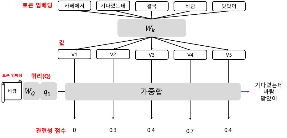 아래 그림과 같이 쿼리와 키값의 관계를 계산한 관련성 점수와, '바람'의 토큰 임베딩을 값 가중치(Wv)로 변환한 V(값)를 가중합하면, 우리가 의도한 '배신'을 의미하는 '바람'으로 재해석된 결과를 얻을 수 있습니다.