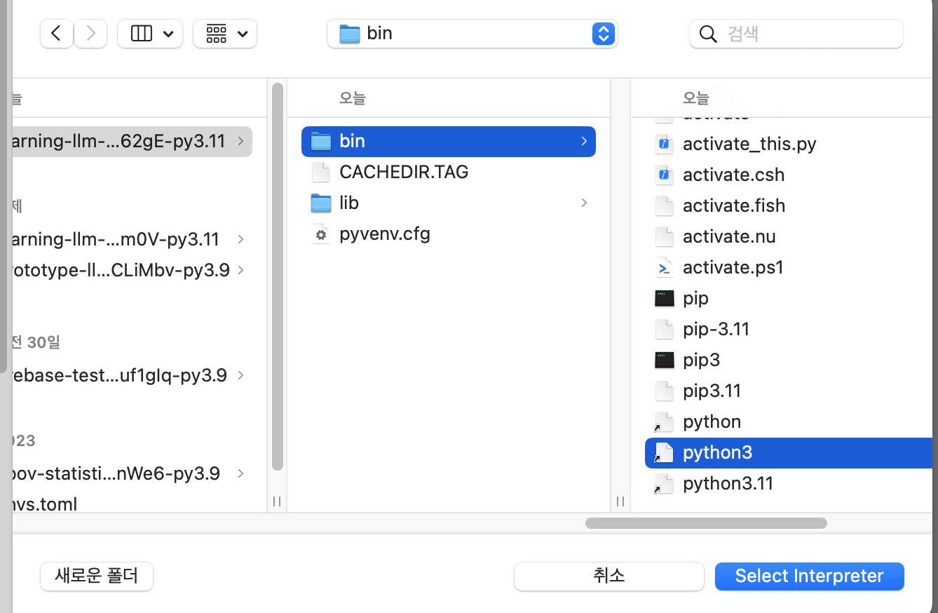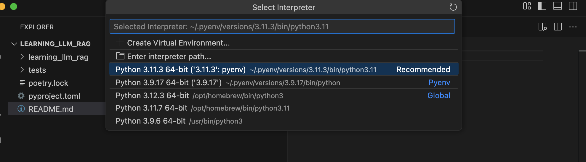 - 예제 이미지를 참고하면 ~/Library/Caches/pypoetry/virtualenvs/learning-llm-rag-2H8G62gE-py3.11에 가상환경이 있습니다.