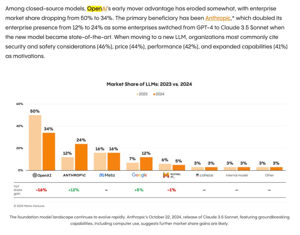 OpenAI, Anthropic, Meta, Google 등 주요 기업들이 인프라를 확장하며 LLM 모델을 지속적으로 발전시키고 있습니다. 2023년 OpenAI의 GPT-3 출시 당시에는 그 성능이 압도적이었습니다. 그러나 2024년에는 여러 기업의 LLM 모델들은 물론 오픈소스 영역에서도 GPT와 견줄 만한 성능 향상이 두드러졌습니다.