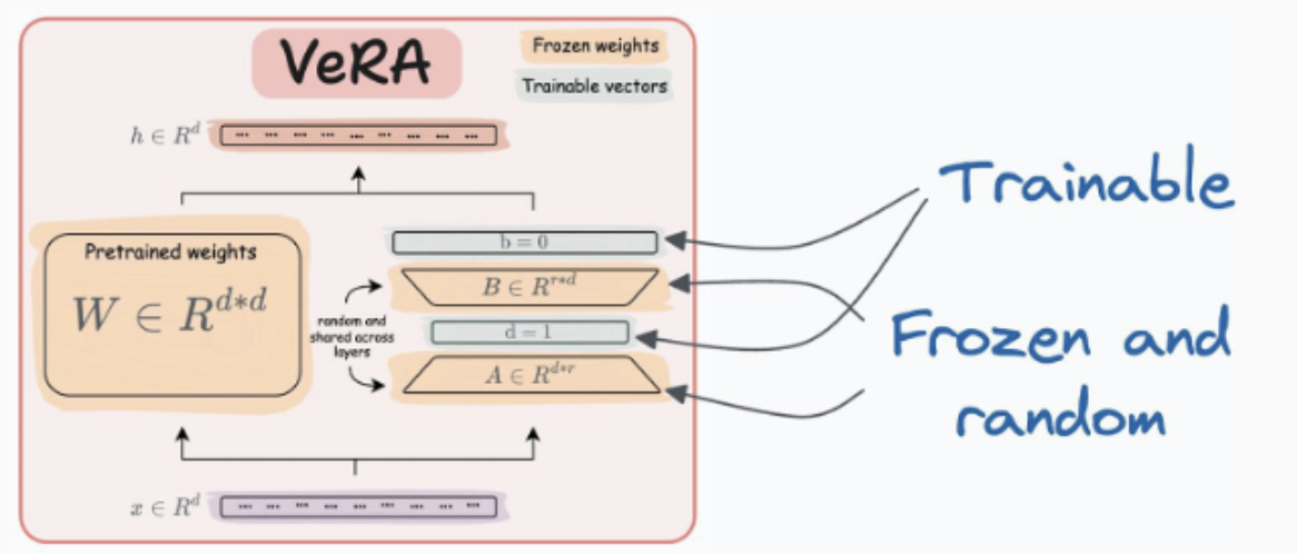 ✅ VeRA: A와 B 행렬을 공유하여 연산량을 더욱 줄이고, 메모리를 절약