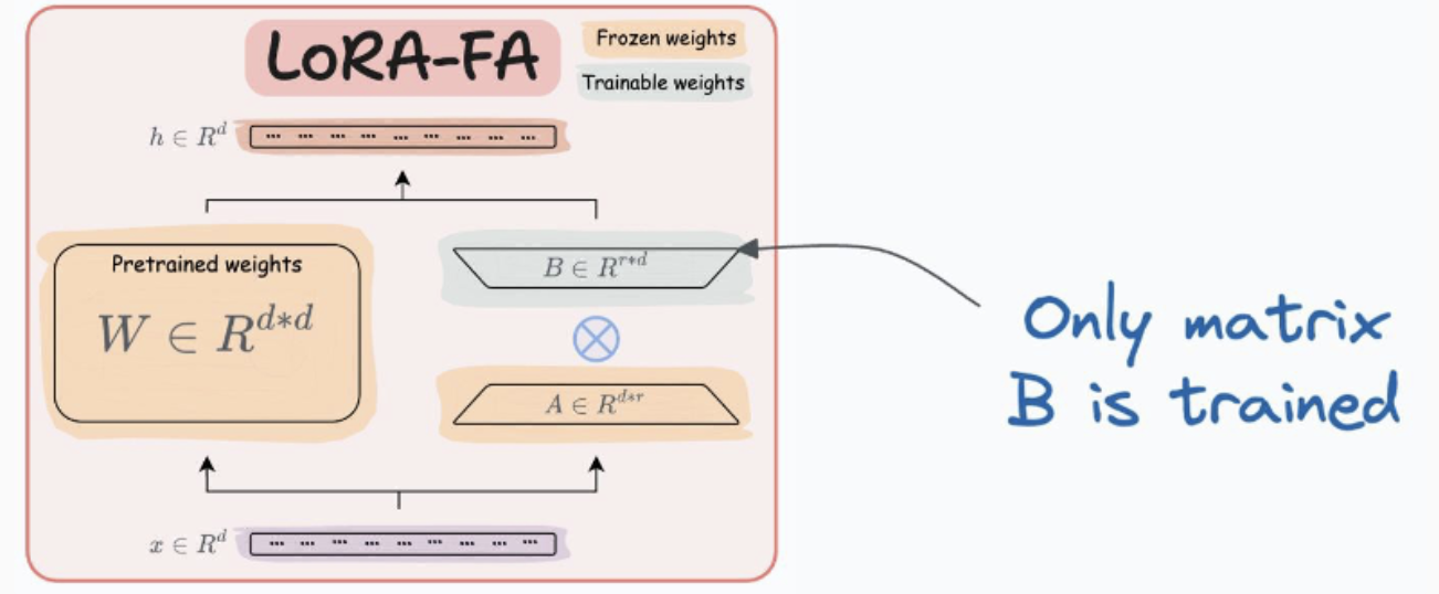 LoRA는 연산량을 줄이지만, 여전히 활성화 메모리(Activation Memory)를 많이 필요로 합니다. LoRA-FA는 행렬 A를 **고정(Frozen)**하고, 행렬 B만 업데이트하는 방식으로 메모리 사용량을 더욱 줄입니다.