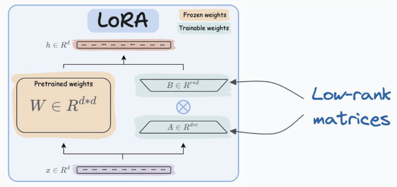 LoRA는 기존의 가중치 행렬(W)을 직접 업데이트하는 대신, 저차원 행렬 A와 B를 추가하여 학습하는 방식입니다. 즉, W를 그대로 두고, A와 B 행렬을 학습하여 모델을 미세 조정합니다.