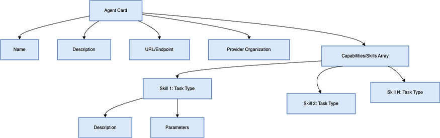 A2A에서 가장 중요한 구성 요소 중 하나는 Agent Card입니다. Agent Card는 해당 에이전트가 어떤 역할을 하고 어떤 작업을 수행할 수 있는지를 설명하는 JSON 기반의 메타데이터 파일입니다. 이 파일을 통해 에이전트를 사전 통합 없이도 쉽게 탐색하고 호출할 수 있습니다.